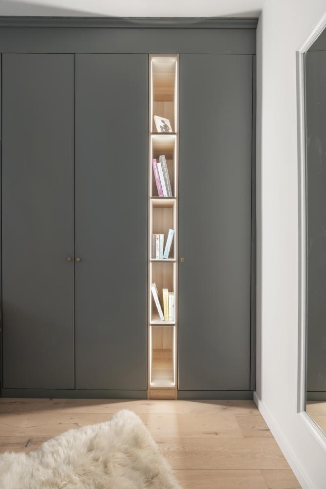 De två rymliga sovrummen erbjuder gott om plats för både vila och förvaring. Master bedroom har en platsbyggd lösning med garderober runt sängen, infällda sängbord, integrerad belysning och smarta eluttag – en elegant och funktionell lösning som maximerar utrymmet. Här finns även en inbyggd garderob.