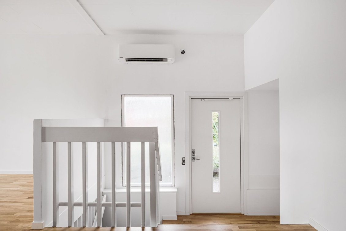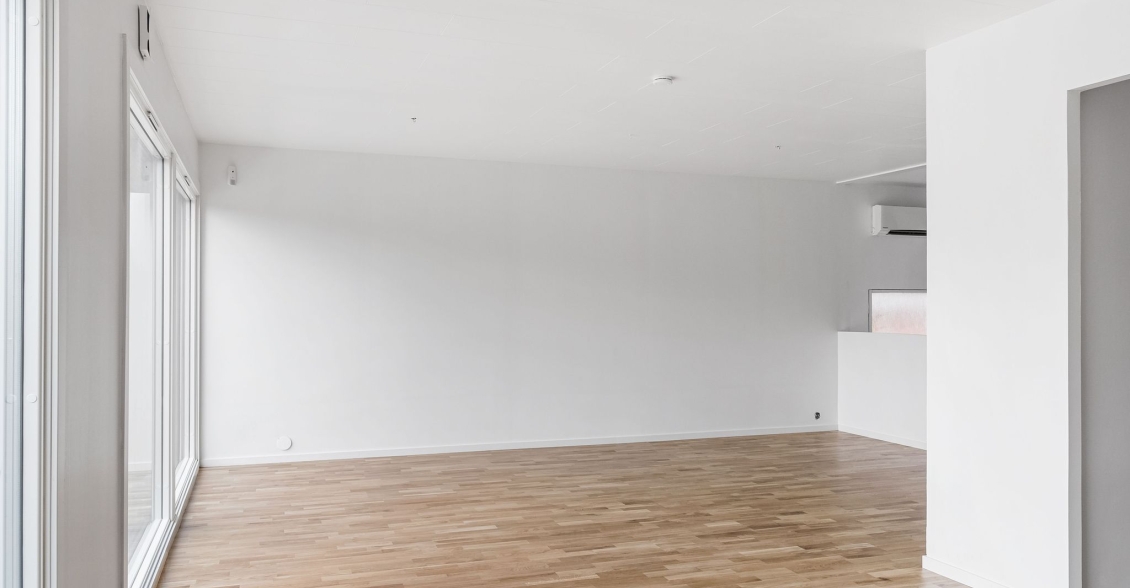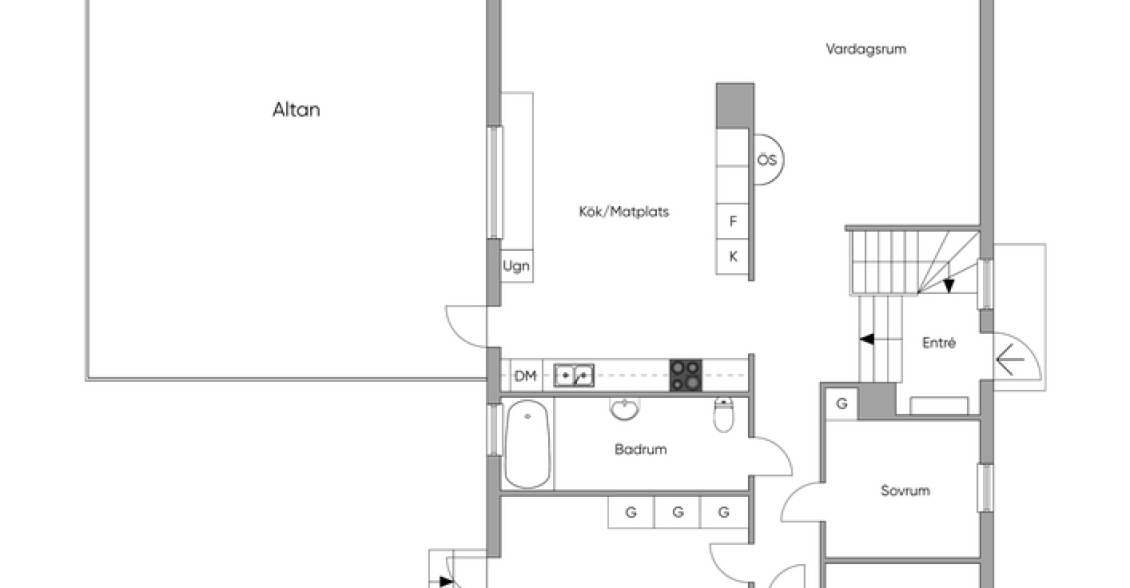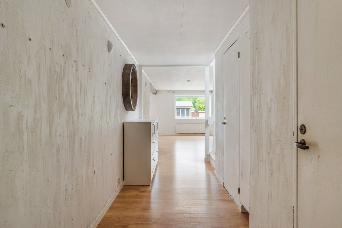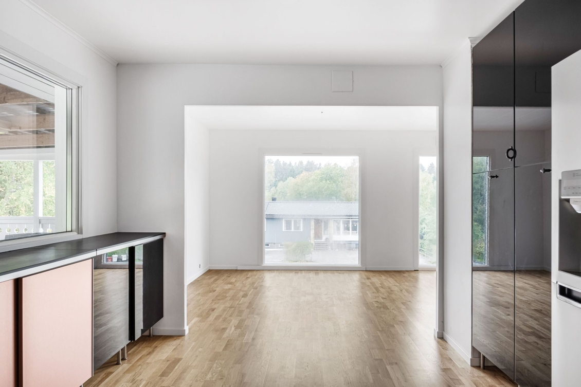 Hall Välkomnande hall som mynnar ut till alla utrymmen på våningsplanet; Vardagsrum och kök i öppen planlösning samt tre sovrum.