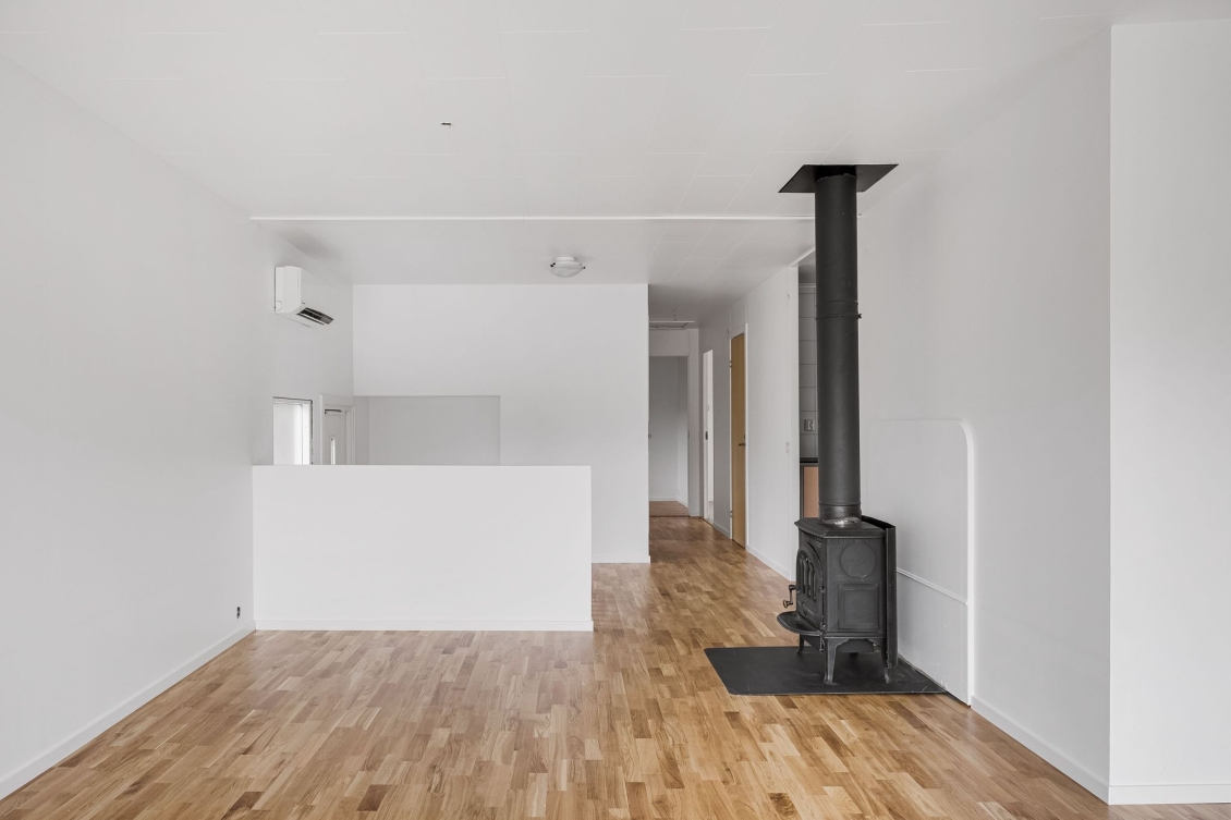Vardagsrum Ett stort fönsterparti skänker ljus och trivsel och i mitten finns en mysig eldstad. Vardagsrummet är tillräckligt stort för att rymma både middagsbord och soffmöblemang. Trevlig öppan planlösning mot kök.