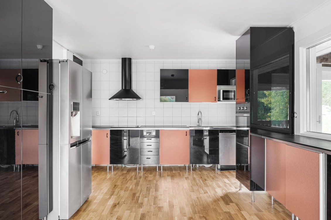 Kök Köket monterades 2008 och går i högglansigt svart ovh rosé. Generösa arbetsytor och förvaring. Kyl och frys saknas.