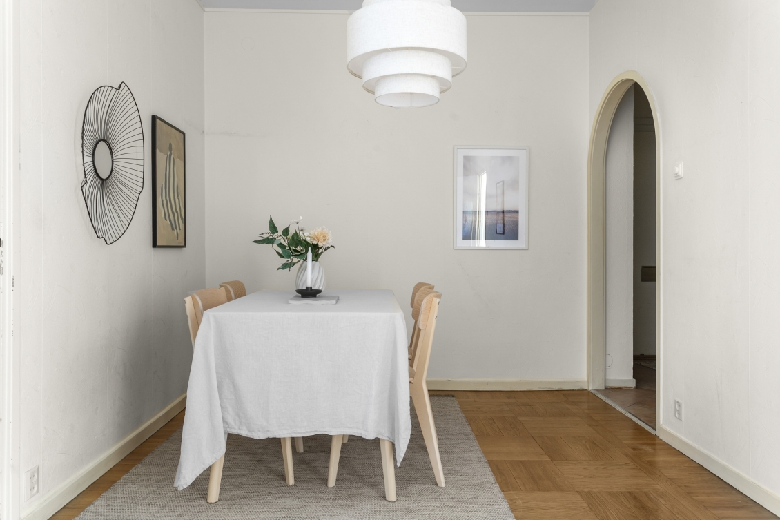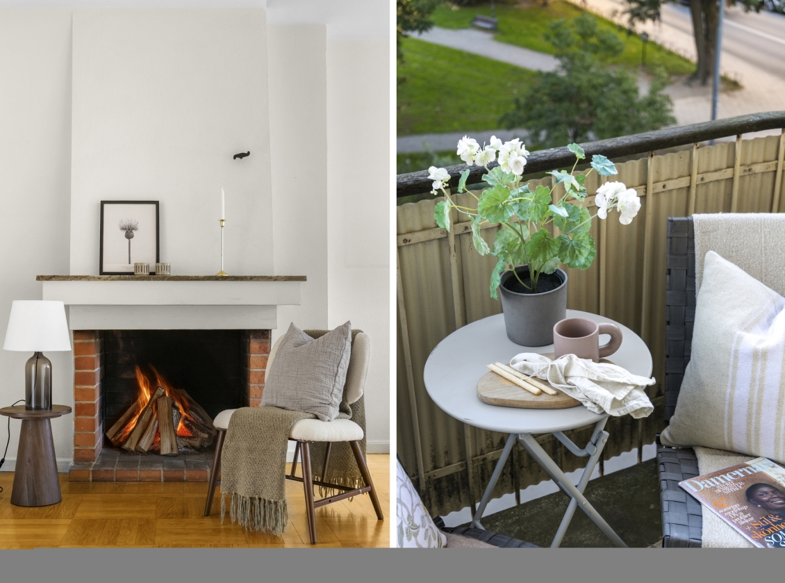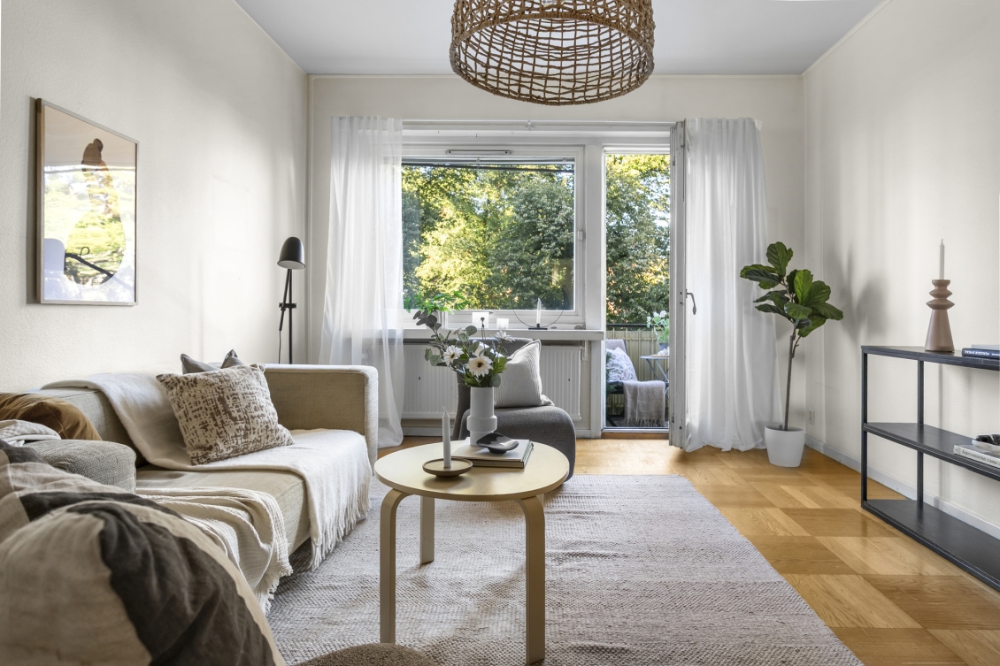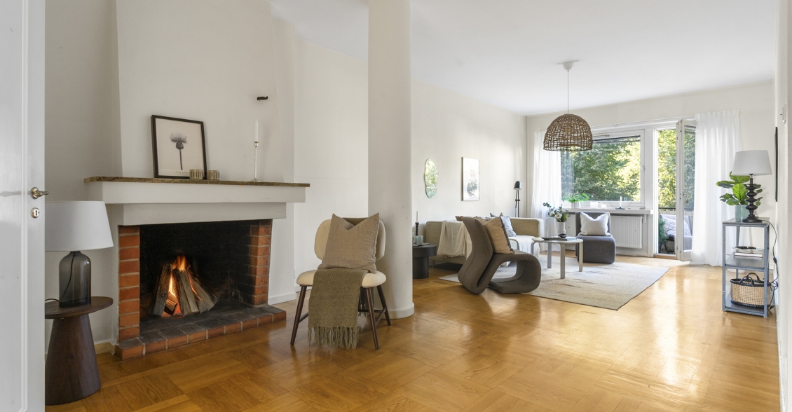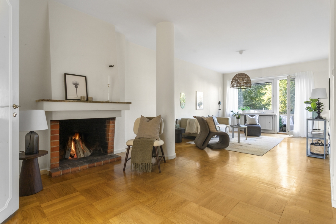 Luftigt vardagsrum med en stor eldstad och fönster mot den lummiga Stureparken. Utgång till balkong som även den vetter mot parkens grönska. Holländsk ekparkett som sträcker sig från den inre delen av hallen in vardagsrum och sovrum.