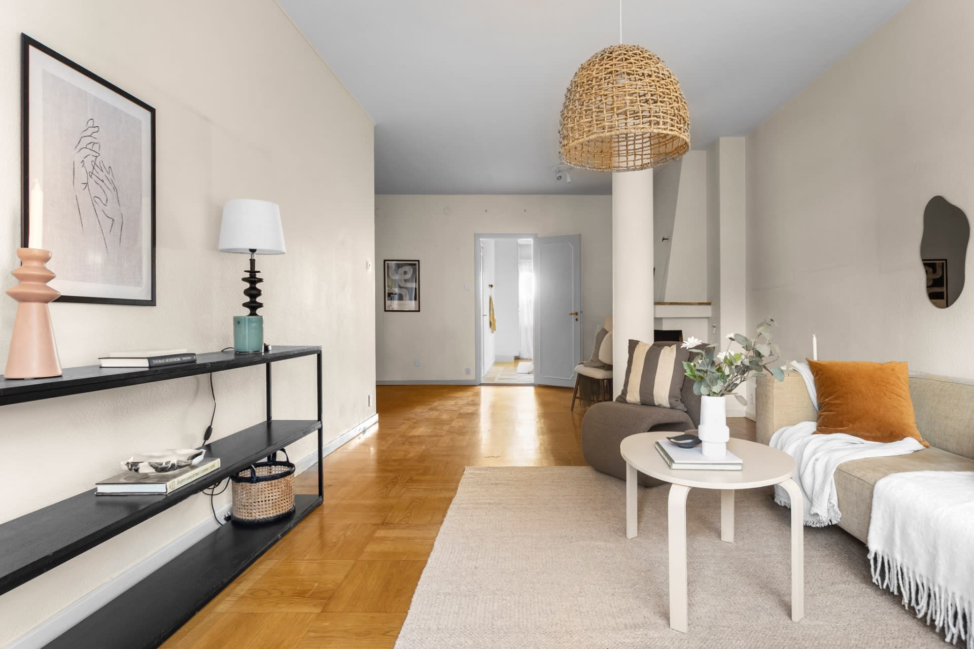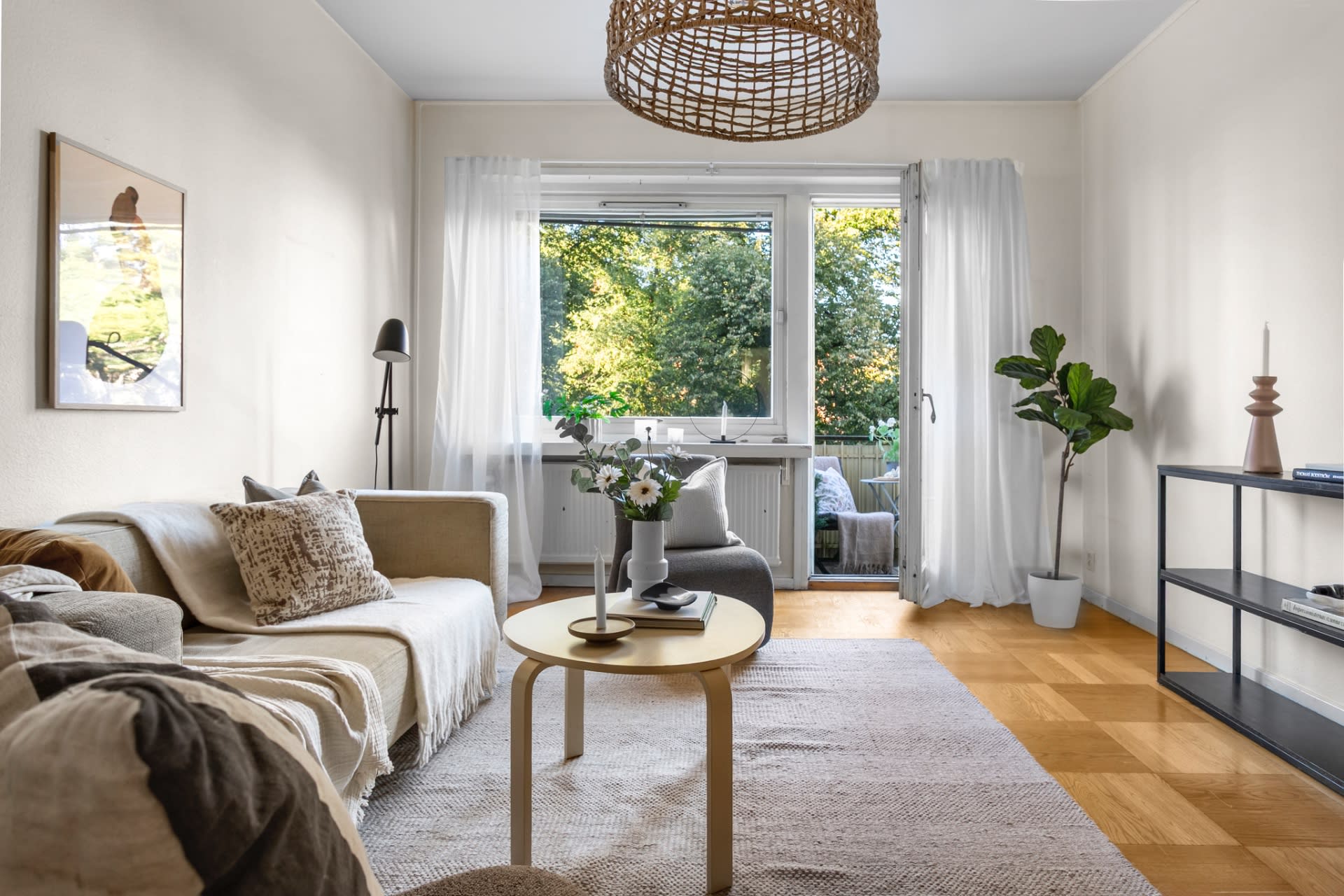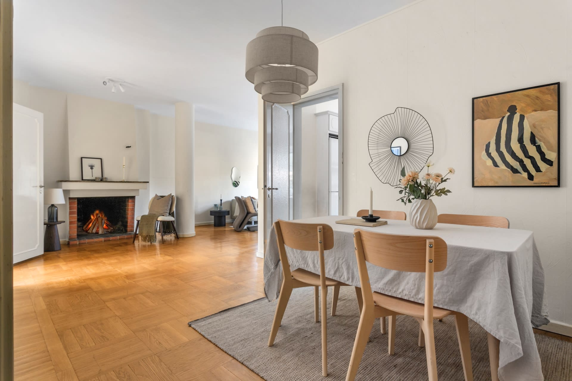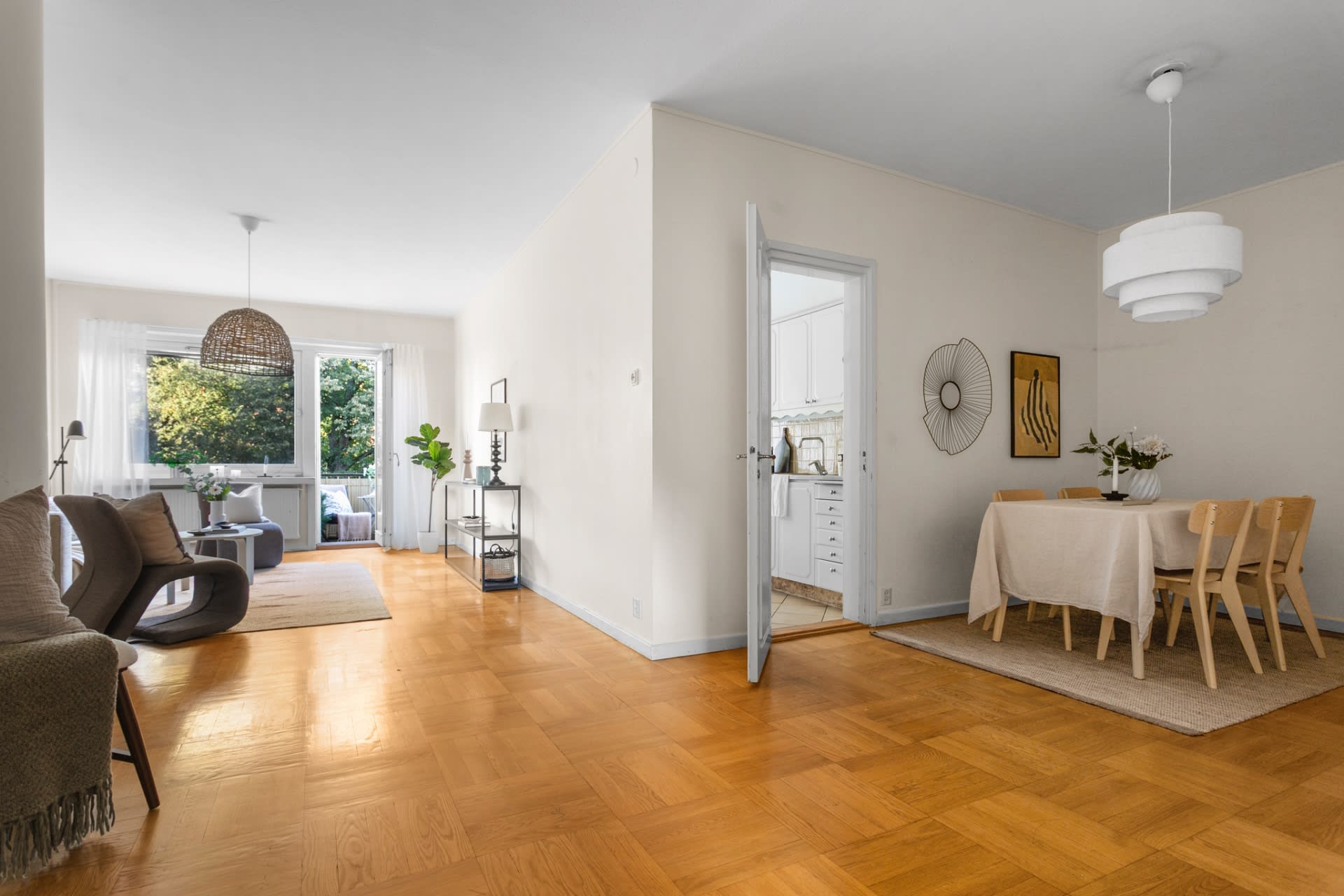 Charmig tvårummare i tidstypisk funkisstil med eldstad och balkong.