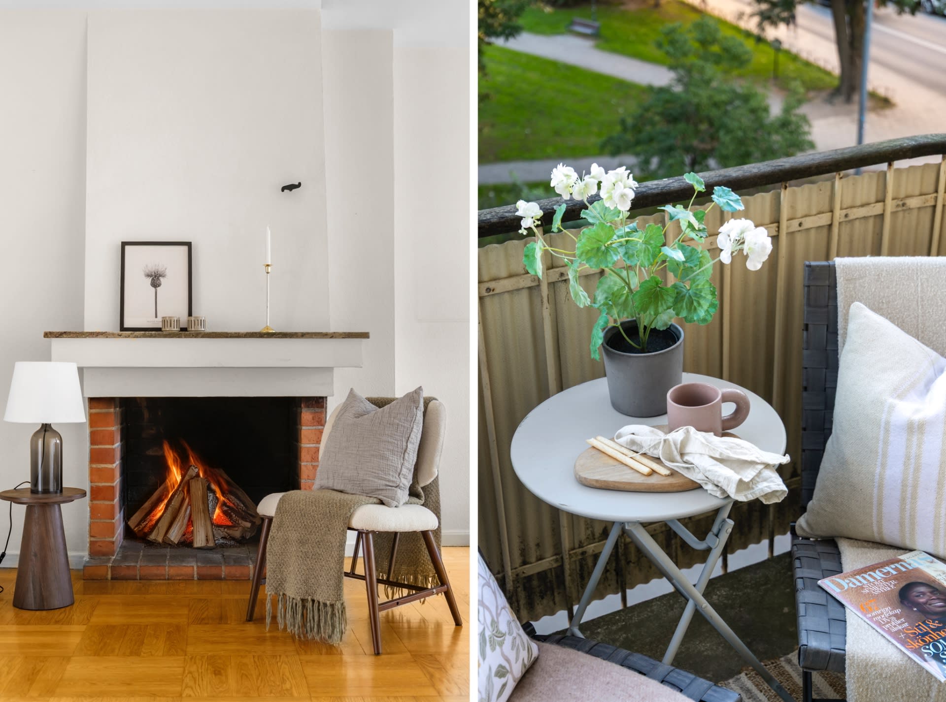 Charmig tvårummare i tidstypisk funkisstil med eldstad och balkong