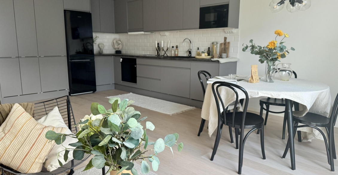 Vardagsrum och kök i ljus öppen planlösning mot kök.