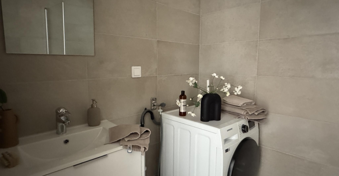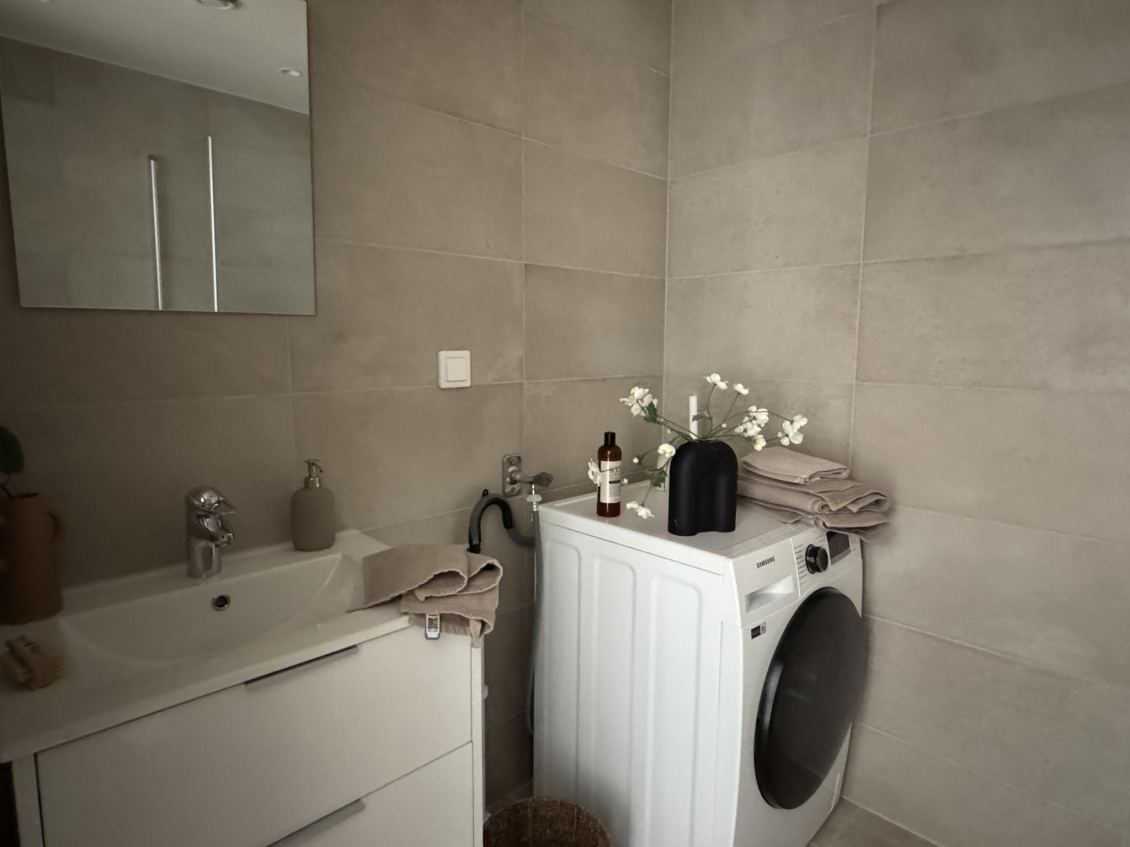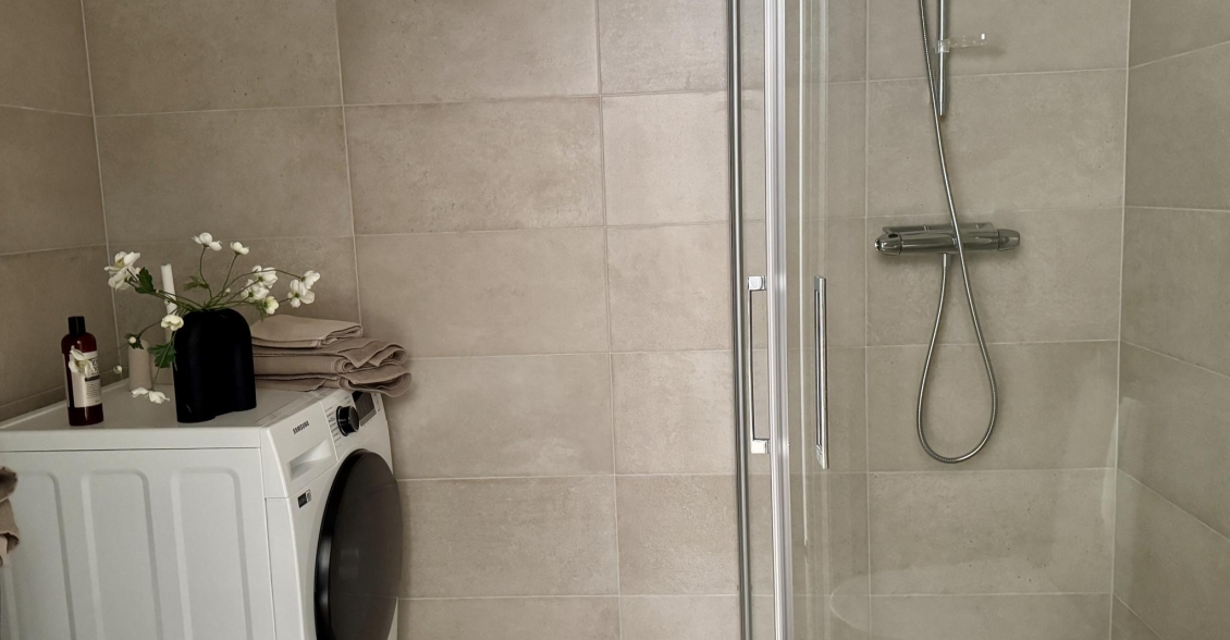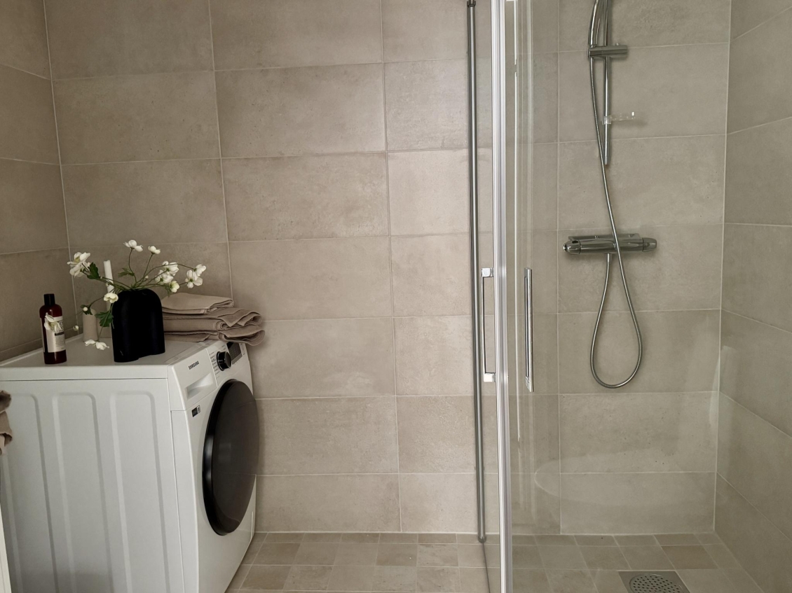 Helkaklat badrum med dusch, wc och handfat med kommod. Tvättmaskin och torktumlare.